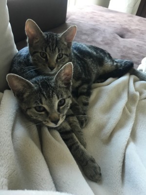 Sie spielen noch sehr viel, sind super aktiv, manchmal etwas nervig und müssen noch viel lernen, auch im Umgang mit anderen Katzen.